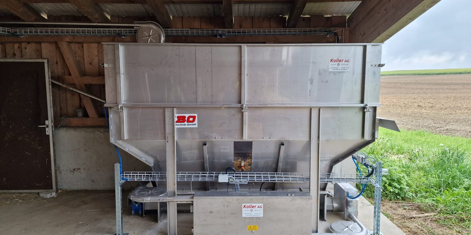 Le matériau d’épandage est alimenté de manière centralisée au niveau du démêleur de balles ou de la trémie de stockage et transporté dans l’étable au moyen d’un système de transport à poulies.