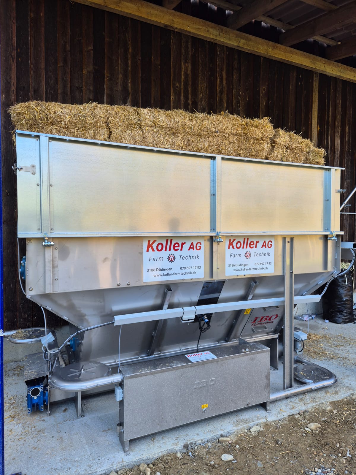 Das Streugut wird zentral am Ballenauflöser oder Vorratsbehälter aufgegeben und mittels Seilscheiben-Förderanlage in den Stall transportiert.